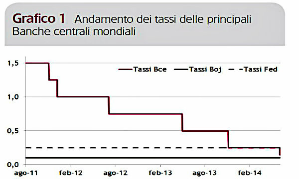 Come? Attraverso un “pacchetto” di misure che contribuiranno in primo luogo a migliorare il sistema di distribuzione del credito nell’Eurozona, facilitando esclusivamente le banche che concederanno finanziamenti alle società non finanziarie del settore privato. In particolare, per affrontare il problema del “credit crunch” - uno dei principali ostacoli alla ripresa economica anche in Italia - si ricorrerà a due nuovi programmi di rifinanziamento a lungo termine delle banche (Long-term refinancing operation, o Ltro) e all’acquisto di Asset backed securities (Abs) - la vera novità – cioè di titoli cartolarizzati, basati su prestiti bancari. Inoltre, il Consiglio direttivo della BCE, fra gli altri interventi, ha deciso di tagliare ulteriormente il costo del denaro, portandolo al minimo storico dallo 0,25% allo 0,15% (Grafico 1).