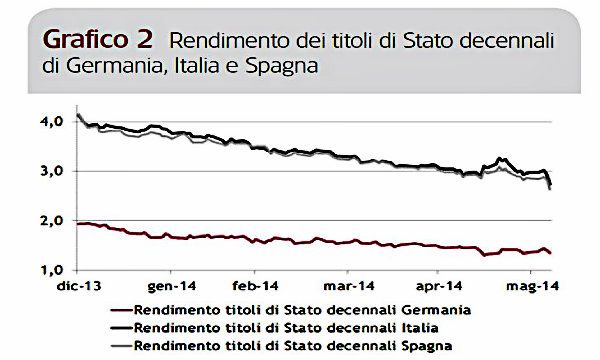 Alla base della scelta della BCE, la volontà di rispettare il proprio mandato, facendo fronte con determinazione al pericolo deflazione, vista la continua discesa dei prezzi nell’Eurozona, la cui crescita a maggio è scesa allo 0,5%. Il rischio, in sintesi, è rappresentato dal fatto che il permanere dell’inflazione su livelli estremamente modesti condizioni le aspettative e di conseguenza le scelte di consumo/investimento dei diversi attori del sistema economico. Le Borse europee hanno reagito in modo positivo alle misure anti-deflazione decise da Francoforte conoscendo nuovi massimi - in particolare Piazza Affari che da inizio anno ha registrato un +16% - e i tassi nell’Area Euro hanno risposto scendendo (Grafico 2).