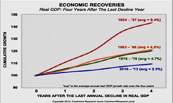 Mindy: Caro Mork, come certamente saprai, analizzare le variabili a livello aggregato o per singolo componente può portare a conclusioni molto diverse tra loro. Anche se nel complesso l'economia americana cresce a livelli estremamente contenuti rispetto al suo passato e rispetto alla quantità di denaro che è stata immessa nel sistema, è pur vero che un pochino cresce, certamente ben più di quanto cresca la vecchia Europa. Se infatti facciamo qualche confronto con il passato ci accorgiamo facilmente che mentre gli indici azionari sono cresciuti spasmodicamente, questo non è affatto accaduto per l'economia, migliorata, certo, ma in misura largamente inferiore di quanto dicano i prezzi delle azioni. Ho di recente visto un grafico metteva in relazione la crescita dell’economia americana in fasi successive alle più importanti crisi degli ultimi 100 anni. Ebbene, a fronte ad un dato medio annuale del 9,4% tra il 1934 ed il 1937, a fronte ad un dato del 4,9% tra il 1983 ed il 1986 e del 4,7% tra il 1976 ed il 1979, abbiamo registrato tra il 2010 ed il 2013 un dato medio di crescita “solo” del 2,3% medio annuo. Ripeto, nonostante gli straordinari ed eccezionali immissioni di liquidità compiuti dalla Federal Reserve. Credo non si possa confutare che la media di crescita dopo l'ultima crisi sia ampiamente inferiore al passato.