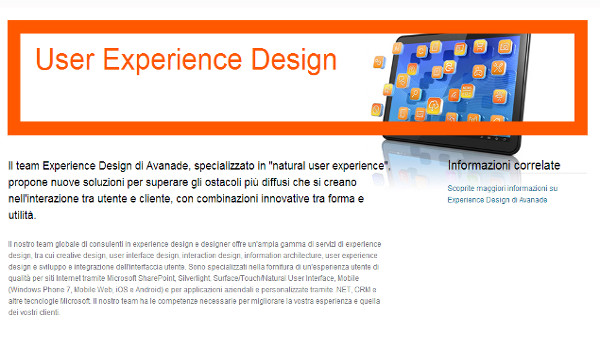 "Noi adottiamo una metodologia che si chiama Human Centered Design: parte dalla convinzione che stiamo progettando degli artefatti digitali per delle persone e bisogna partire proprio dallo studio di quest'ultime. Bisogna comprendere i bisogni, le aspettative e le abitudini per realizzare un'interazione. I nostri clienti solitamente ci indicano due tipi di brief: aiutarli a vendere di più o rendere più efficienti i processi interni. Nel primo caso si tratta di creare applicazioni che vanno verso il consumatore finale, nel secondo si tratta di creare applicazioni che saranno utilizzate dai dipendenti. In entrambi i casi noi come Avanade partiamo ascoltando le esigenze dei nostri clienti e stabiliamo degli obiettivi che alla fine del processo andremo a misurare. Una volta capiti gli obiettivi dei nostri committenti, facciamo un passaggio coinvolgendo le persone, o con i consumatori o con i dipendenti a seconda dell'obiettivo principale. Il passaggio con le persone di solito consiste in una serie di interviste, focus group o addirittura delle osservazioni, anche nei negozi per capire cosa vogliono e come si comportano i clienti. Una volta capiti i clienti torniamo in ufficio e realizziamo un concept, un'idea su come potremo aiutare i nostri clienti a raggiugere i loro obiettivi. Il concept di solito viene rivalutato con gli utenti finali. Il prototipo viene sottoposto alle persone e capiamo se piace, se hanno aspettative diverse e se risponde in parte o completamente ai loro bisogni e in funzione delle risposte ottenute facciamo degli aggiustamenti prima di realizzare la soluzione".