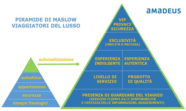 La gerarchia dei bisogni di Maslow può essere applicata all'esperienza di viaggio. Più il viaggiatore è abituato al lusso, più avrà bisogno di ottenere risposta ai bisogni più alti nella piramide, per mantenere ed innalzare il proprio livello di soddisfazione. Questa gerarchia di bisogni è stata validata da un pool di esperti del luxury travel in occasione dell'evento Connections Luxury 2016.