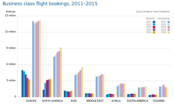 Le prenotazioni di alberghi di alta classe sono cresciute del 7% fra il 2014 e il 2015 a livello mondiale. Il Nord America e l'Europa Occidentale costituiscono attualmente il 64% dei viaggi oltreconfine di business o prima classe, nonostante compongano solamente il 18% della popolazione globale. Il Nord America continua a dominare il mercato detenendo la maggiore quota come mercato maturo. Negli USA e Canada inoltre il volume dei viaggi in business e prima classe si è rivelato stabile e superiore al resto del mercato globale.