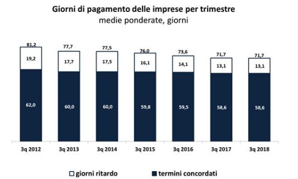 Le microimprese hanno pagato i fornitori in 60,5 giorni (erano 61 nel 2017) grazie a un'ulteriore diminuzione delle scadenze (da 47,4 a 47 giorni) e a un lieve calo dei ritardi (da 13,6 a 13,5); anche la quota di società puntuali è cresciuta significativamente (da 48,3% a 51,8%). Le grandi imprese hanno ridotto i tempi da 83,8 a 83,3 giorni, calo dovuto alla riduzione sia dei ritardi (da 16 a 15,8) che delle scadenze (da 67,7 a 67,5). Ciononostante, sono in diminuzione pure le società puntuali (da 10,6% a 10,1%), mentre aumentano quelle in ritardo, lieve (da 84,4% a 84,5%) e grave (da 5% a 5,4%). Le PMI, al contrario, evidenziano un aumento dei giorni medi di ritardo (da 10,9 a 11 giorni), compensato da scadenze più brevi (da 59,5 a 59,4) che lasciano immutati i tempi medi di liquidazione a 70,4 giorni. In aumento le PMI puntuali, da 39,2% a 40,1%, ma anche quelle con ritardi oltre i 60 giorni (da 4,7% a 4,9%).