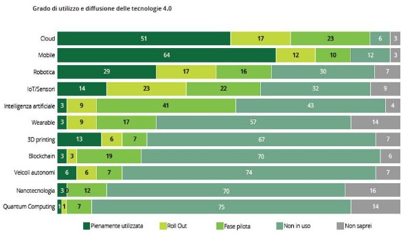 La necessità di adottare le nuove tecnologie 4.0 per mantenere un vantaggio competitivo anche in futuro rappresenta un aspetto cruciale per le imprese italiane (secondo il 32% degli intervistati), in particolare nei comparti Cloud (59%), Mobile (64%), Robotica (29%), dell'Internet of Things (14%) e Intelligenza Artificiale (3%).