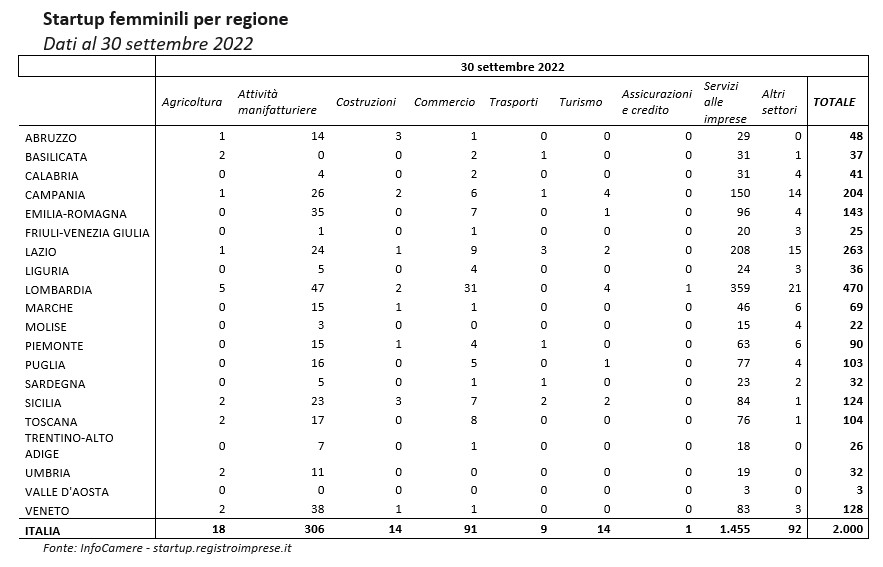 Malgrado la pandemia, l'innovazione al femminile cresce. Sono duemila le startup innovative femminili registrate a fine settembre 2022, 572 in più rispetto allo stesso periodo del 2019. Proprio a cavallo dell'epidemia da Covid-19, insomma, molte donne hanno dato vita a questa particolare tipologia di impresa, costituita nella forma di società di capitali, specializzata nello sviluppo, nella produzione e nella commercializzazione di un prodotto o servizio ad alto valore tecnologico.