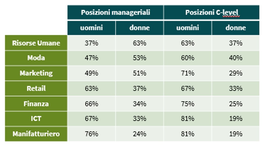 Da notare, inoltre, come in settori tradizionalmente considerati "maschili", come IT e Manifattura, la presenza femminile sia già in partenza inferiore a quella dalla controparte, e l'imbuto tra posizioni manageriali e ruoli con potere decisionale sia ancora più marcato.