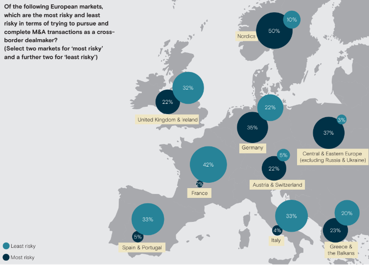 Ma è la percezione del rischio a riservare le maggiori sorprese: il Paese con meno ostacoli per un cross-border M&A? Il 42% degli interpellati dice la Francia, seconda posizione - ex aequo con il Portogallo e la Spagna - per l'Italia (33%). Metà degli interpellati cita i Paesi scandinavi come i più rischiosi.