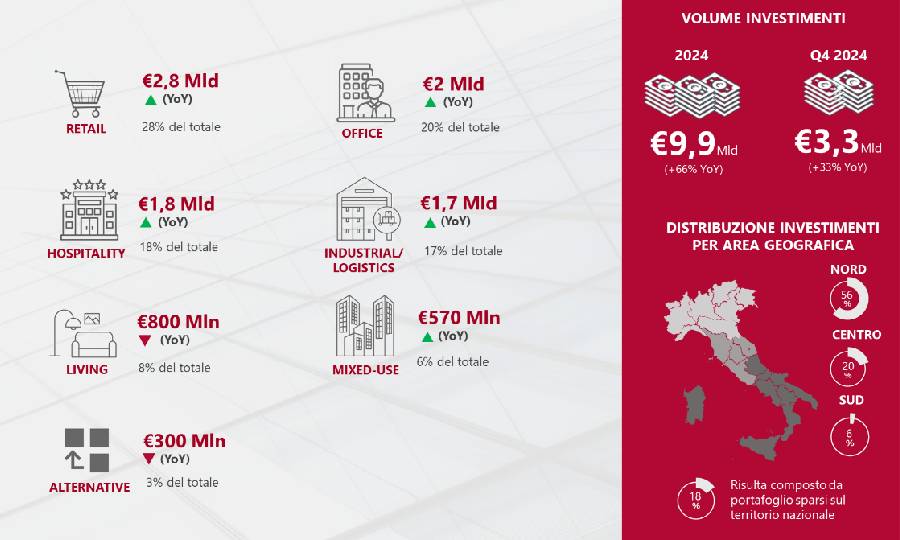 Analizzando le diverse asset class, il settore retail ha primeggiato con 2,8 miliardi di euro investiti, grazie a operazioni eccezionali come quella da 1,3 miliardi di euro in Via Monte Napoleone a Milano. Il settore degli uffici ha seguito con quasi 2 miliardi di euro, registrando una crescita del 64% rispetto al 2023.
