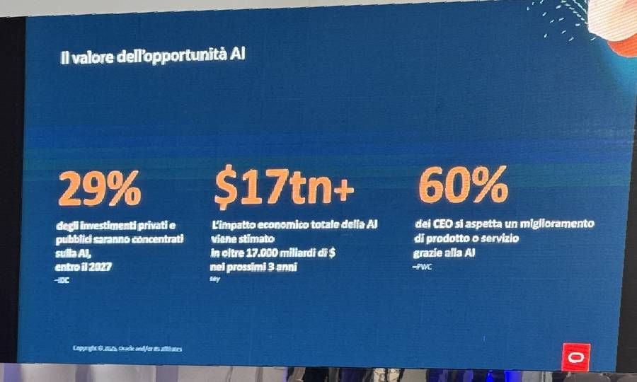 L'intelligenza artificiale non è più un concetto futuristico, ma una leva strategica per le aziende. Lo ha ribadito Oracle durante il Data & AI Forum. L'evento ha riunito molte aziende e istituzioni per esplorare le potenzialità dell'AI, destinata a generare un impatto economico di oltre 17.000 miliardi di dollari nei prossimi tre anni.