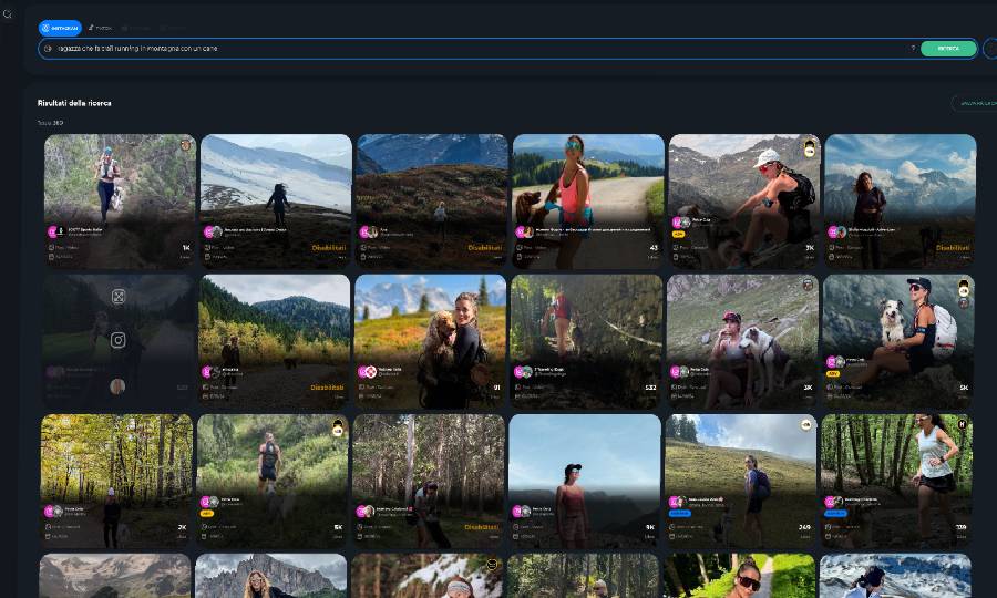 Content Search si distingue per la sua capacità di sfruttare l'intelligenza artificiale per analizzare e interpretare le richieste degli utenti. Utilizzando un semplice prompt di ricerca, come "Ragazza che fa trail running in montagna con un cane", il sistema è in grado di restituire in pochi secondi una selezione accurata di contenuti social pertinenti, completi di insight e metriche di performance.