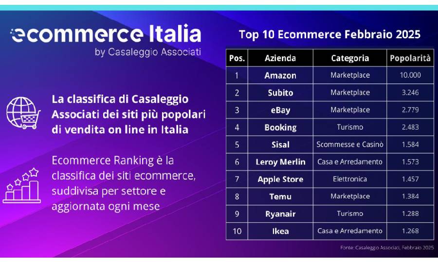 La classifica dell'ultimo mese conferma il dominio dei marketplace, con Amazon, Subito ed eBay saldamente ai primi tre posti. Seguono poi il portale di prenotazioni turistiche Booking e il sito di scommesse Sisal. Guadagnano posizioni importanti realtà come Leroy Merlin, Temu, Ryanair e Ikea.
