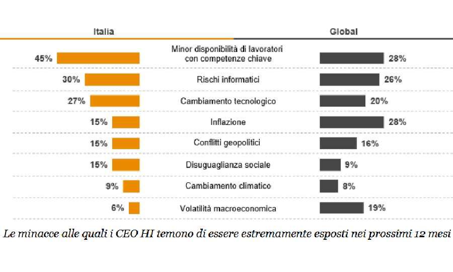 Nonostante gli sforzi per affrontare le sfide attuali, oltre la metà dei CEO delle Health Industries italiane (55%) è incerta sulla sostenibilità economica della propria azienda nel prossimo decennio. Questo dato segna una netta crescita rispetto al 2024 (+17%) ed è superiore alla media globale (+9%). Tra i fattori che minano la sostenibilità in Italia spiccano le pressioni sui margini dovute all'aumento dei costi (+39%), lo scarso potere di determinazione dei prezzi (+34%) e un alto livello di inefficienza organizzativa (+17%). In Italia, i CEO del settore Health sono maggiormente preoccupati per la mancanza di professionisti con competenze chiave (45% dei CEO italiani vs 28% dei CEO globali), per i rischi informatici (30% vs 26% globali) e per il cambiamento tecnologico (27% vs 20% globali), mentre variabili macroeconomiche come inflazione (15% vs 28% globali) e conflitti geopolitici preoccupano meno i CEO italiani rispetto alla media mondiale.