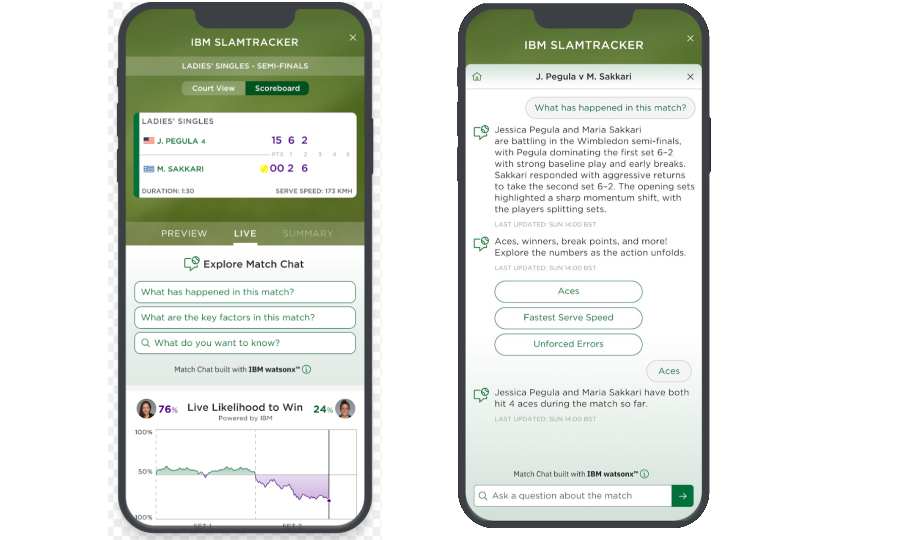 Le nuove funzionalità di quest'anno incoraggeranno il pubblico di Wimbledon a immergersi e a partecipare a tutta l'azione della partita come mai prima d'ora. Dal canto suo, Jonathan Adashek, Senior Vice President of Marketing and Communications di IBM, ha aggiunto: Soluzioni come Match Chat e Likelihood to Win mostrano come l'intelligenza artificiale su watsonx possa offrire agli appassionati di tennis informazioni avvincenti in tempo reale e il coinvolgimento delle partite che desiderano in questo torneo storico e con i suoi giocatori. La nostra partnership di 35 anni con l'All England Club è un altro esempio di come IBM aiuti i clienti a sbloccare e ottenere un valore duraturo dai loro dati unici utilizzando l'AI.