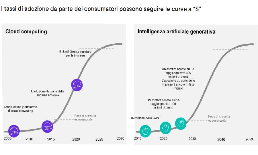 Una caratteristica particolare di molte tecnologie innovative è la crescita esponenziale: un inizio lento, seguito da una ripida curva a S. Lo scetticismo iniziale è tutt'altro che raro. Costi elevati, modelli non collaudati o curve di apprendimento ripide scoraggiano spesso da un'adozione precoce. Tuttavia, con l'abbattimento delle barriere, la crescita può superare notevolmente le previsioni, come hanno dimostrato l'eCommerce negli anni 2000 e il cloud computing negli anni 2010. Attualmente stiamo riscontrando un andamento simile con l'AI generativa. Mentre qualcuno mette in dubbio il potenziale commerciale dell'AI, da parte nostra vediamo elementi che ricordano le transizioni passate. Il ciclo di innovazione sta accelerando, gli strumenti stanno diventando più accessibili e i costi stanno scendendo. Riteniamo che individuare precocemente questi modelli, e mantenere la nostra convinzione, possa offrire agli investitori un potente vantaggio.
