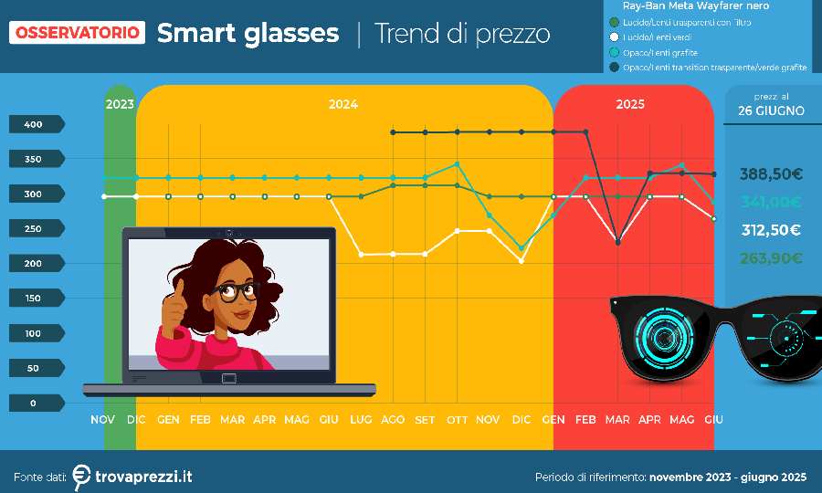 L'interesse crescente per i Ray-Ban Meta è confermato dai dati di Trovaprezzi.it, piattaforma leader in Italia per la comparazione dei prezzi. A partire da maggio 2025, le ricerche mensili relative a questi occhiali hanno registrato un aumento di oltre il 200% rispetto ai mesi precedenti, evidenziando una forte attenzione da parte dei consumatori. Su Trovaprezzi.it, i Ray-Ban Meta rappresentano quasi la totalità delle ricerche nella categoria degli smart glasses.