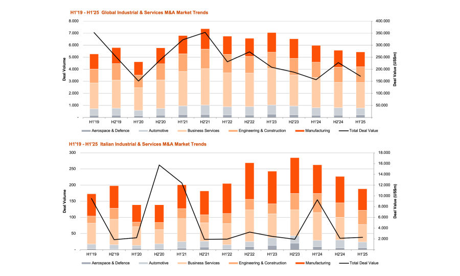 L'innovazione tecnologica si conferma un motore per l'attività di M&A, nei segmenti dell'automazione, robotica e trasformazione digitale industriale. Crescono gli investimenti in AI e tecnologie avanzate per la produzione, ritenuti strategici dalle aziende per migliorare la propria produttività e competitività su scala internazionale. Gli sforzi nazionali per modernizzare le infrastrutture, garantire la sicurezza energetica danno impulso ad acquisizioni strategiche. In Europa, l'aumento dei budget destinati alla difesa spinge acquirenti strategici e fondi di private equity a investire in capacità tecnologiche applicabili trasversalmente ai settori industriale e difensivo. Nonostante il contesto generale sia condizionato da disallineamenti nelle valutazioni, politiche commerciali protezionistiche e pressioni sui costi, l'attività M&A mirata prosegue nei settori dei servizi, delle infrastrutture e dei componenti industriali. Le dismissioni strategiche creano nuove opportunità per il private equity, mentre i processi di due diligence si sono intensificati, con un'attenzione crescente all'esposizione ai dazi e alla resilienza delle catene di fornitura. Una maggiore stabilità dei tassi d'interesse e politiche dei dazi nella seconda metà del 2025 potrebbe rappresentare un impulso decisivo per la fiducia degli investitori e accelerare l'attività di M&A a livello globale. Nel mercato industriale e manifatturiero italiano si registrano 67 operazioni nel primo semestre 2025 (vs 89 nello stesso periodo del 2024) tra cui l'acquisizione di Beghelli da parte di Gewiss, di Fubri da parte di Gleason Corporation, di Unionplast da parte di Volpato e di Westrafo da parte del fondo Nextalia.