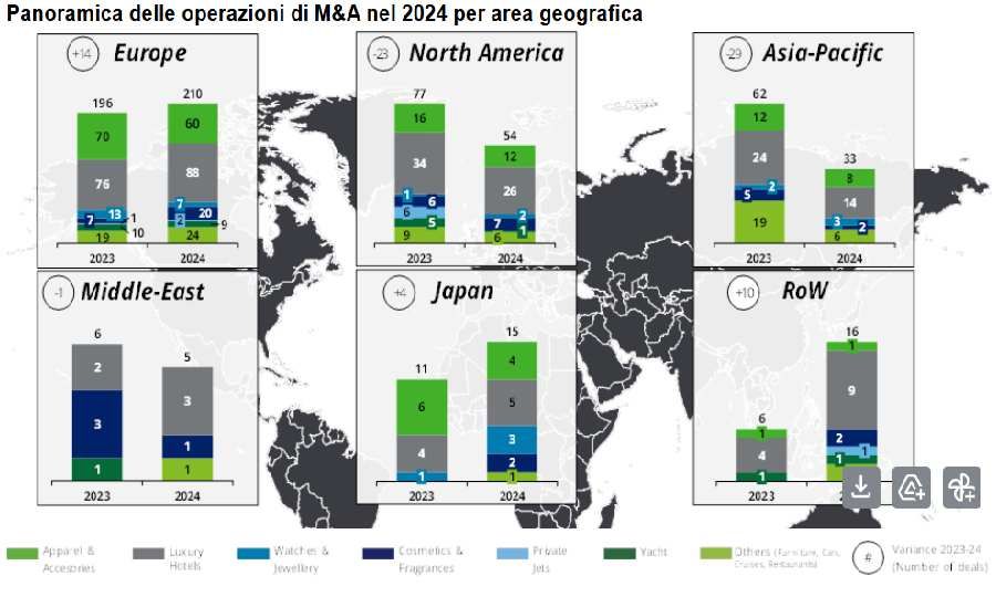Nel dettaglio delle operazioni M&A del 2024, si è osservata una contrazione nei settori Apparel & Accessories (-20 operazioni) e Luxury Cars (-13 operazioni) rispetto al 2023. Al contrario, i settori Cosmetics & Fragrances (+13 deal) e Furniture (+10 deal) hanno registrato una crescita. A livello geografico, le aree APAC e America del Nord hanno subito il calo più marcato (-29 e -23 operazioni rispettivamente), mentre l'Europa ha evidenziato la maggiore crescita (+14 deal). Il valore medio delle operazioni M&A nel 2024 si è attestato intorno ai 260 milioni di euro, in leggero calo (-4%) rispetto all'anno precedente, con una crescente attenzione verso i target di medie dimensioni.