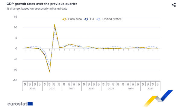 L’anno 2025, nella sua totalità, ha visto una crescita del 1,4 % nell’area dell’euro e dell’1,5 % a livello comunitario, confermando un trend di miglioramento rispetto al 2024.