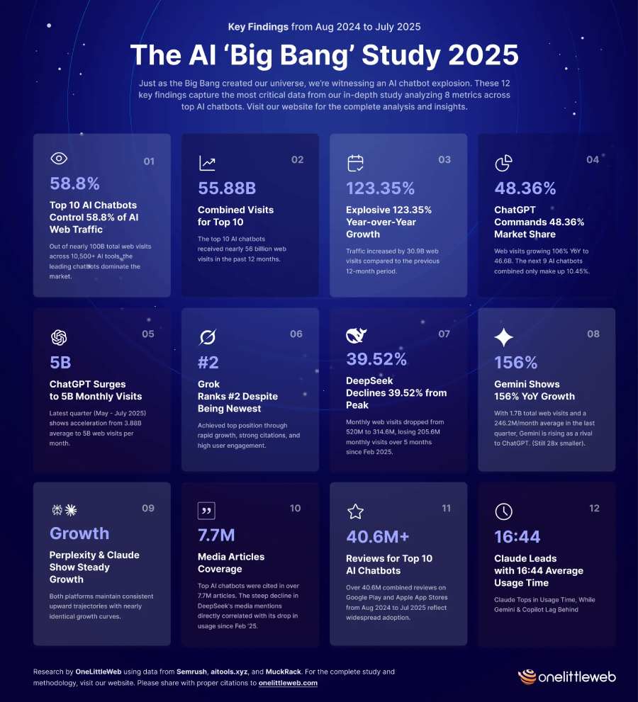 Abbiamo assistito a un'esplosione di piattaforme AI che stanno rimodellando il nostro modo di interagire con la tecnologia. Da un mercato che conta oltre 10.500 strumenti di intelligenza artificiale, capaci di generare quasi 100 miliardi di visite stimate sul web, abbiamo scrutinato i dieci chatbot più influenti emersi da questo cosmo in espansione. Usando dodici mesi di dati sul traffico, la crescita e l'engagement – dal mese di agosto 2024 a luglio 2025 – abbiamo esaminato l'attrattiva di ogni chatbot performante attraverso otto metriche fondamentali, raggruppate in visibilità, slancio ed esperienza utente. Questi dieci chatbot, insieme, catturano il 58,8% di tutto il traffico web del settore AI. È una prova evidente di come, in questo universo AI che si espande rapidamente, un gruppo ristretto di piattaforme stia ormai dominando l'attenzione degli utenti.