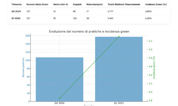 Analizzando più nel dettaglio, nel quarto trimestre, su 2777 richieste di finanziamento, solo il 3,85% rientra nella categoria "green". Nel primo trimestre del 2025, su 2941 pratiche, questa percentuale sale al 5,30%. Un incremento di 1,5 punti percentuali, che, seppur in crescita, rimane ancora contenuto.