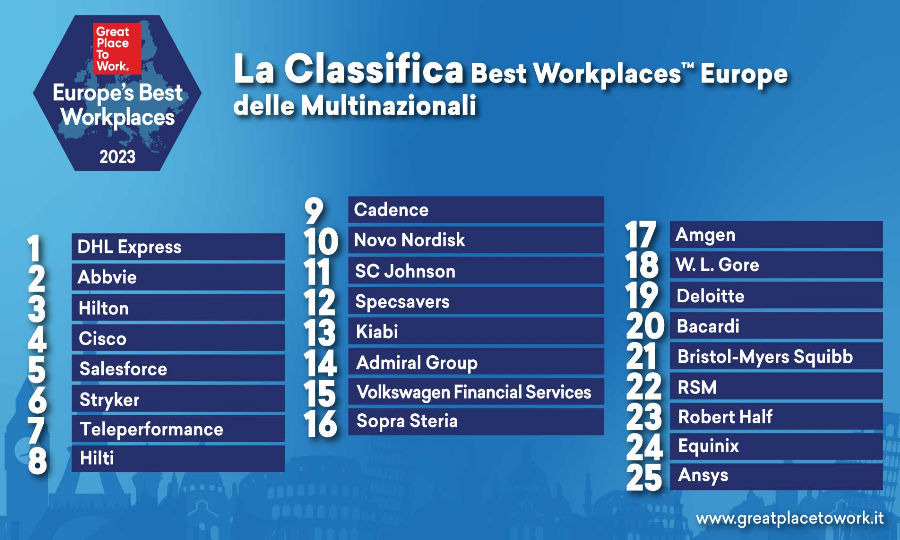La ricerca completa è consultabile. La classifica, suddivisa in 4 categorie (Multi-national Companies, Large, Medium e Small) in base al numero di collaboratori (multinazionali, oltre 500, tra 50 e 499, tra 10 e 49), ha visto le migliori organizzazioni europee ottenere, in media, un dato superiore di 11 punti percentuali (90%) rispetto a quelle premiate nelle diverse classifiche nazionali Best Workplaces (79%). Facendo invece un focus sull'Italia, il nostro Paese è al 5° posto tra quelli europei, insieme a Irlanda, Spagna e Svizzera, per numero di aziende premiate (6%), dietro a Francia (10%), Gran Bretagna (9%), Germania e Turchia (7%) e ha due imprese (Sorgenia e Illimity) che figurano rispettivamente al 13° e al 29° posto tra le 50 Best Large Companies europee.