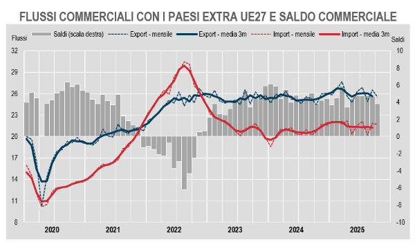 Osservando la performance su base trimestrale, si conferma il rallentamento. Nel trimestre agosto-ottobre 2025, rispetto ai tre mesi precedenti, le esportazioni hanno mostrato una diminuzione dell'1,4%. A questa riduzione hanno contribuito in particolare le minori vendite di beni di consumo durevoli (-6,8%), non durevoli (-3,5%) e beni strumentali (-4,9%). Però, si sono distinte in positivo le esportazioni di energia (+11,2%) e beni intermedi (+6,2%). Nello stesso periodo, l'import ha visto una contrazione dello 0,6%, trainata dal calo degli acquisti di energia (-8,6%) e beni strumentali (-0,5%).