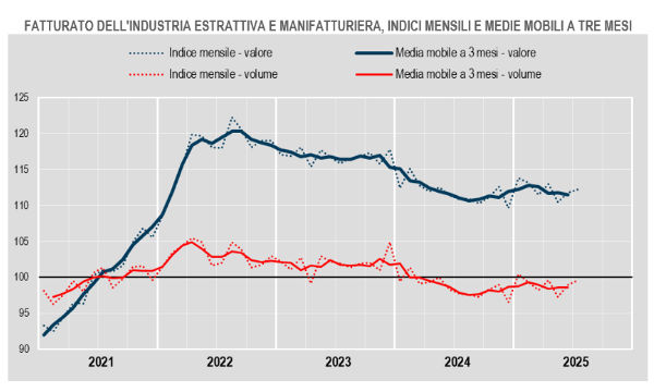 A luglio 2025, il fatturato dell'industria, corretto per gli effetti di calendario (i giorni lavorativi sono stati 23, come a luglio 2024), presenta incrementi tendenziali dell'1,2% in valore e dell'1,9% in volume. Questo aumento è diffuso, interessando sia il mercato interno (+1.1% in valore e +1.5% in volume), sia il mercato estero (+1.5% in valore e +2.8% in volume).
