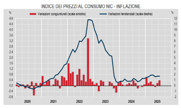 Nel contempo, l'inflazione di fondo, che esclude le componenti più volatili come energetici e alimentari freschi, è rimasta invariata al 2,0%. Analizzando più in dettaglio, l’indice nazionale dei prezzi al consumo per l’intera collettività (NIC), al lordo dei tabacchi, ha segnato un +0,4% su base mensile a luglio 2025. Questa variazione congiunturale positiva è stata trainata principalmente da alcuni aumenti specifici. Tra questi spiccano i prezzi degli Energetici non regolamentati, saliti dell'1,6%, e dei Servizi relativi ai trasporti, che hanno registrato un +1,0%. A questi si aggiungono gli Energetici regolamentati (+0,9%), i Servizi vari (+0,6%) e gli Alimentari lavorati (+0,5%). Una nota di contrasto è rappresentata dai prezzi degli Alimentari non lavorati, scesi dello 0,6% su base mensile. Il differenziale inflazionistico tra il comparto dei servizi e quello dei beni si è leggermente ampliato, raggiungendo +1,9 punti percentuali, in crescita rispetto all'1,8% del mese precedente.