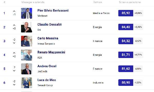 Una notevole ascesa di quattro posizioni ha riguardato Urbano Cairo (76.86), il cui successo è trainato dagli eccellenti risultati di La7, un canale che continua a registrare una crescita costante e ha presentato palinsesti di successo. Il nono posto è occupato da Giorgio Armani (76.79), un'icona di stile e imprenditoria che mantiene salda la sua influenza. Chiude la top ten Matteo Del Fante di Poste Italiane (74.37), la cui gestione continua a generare attenzione.