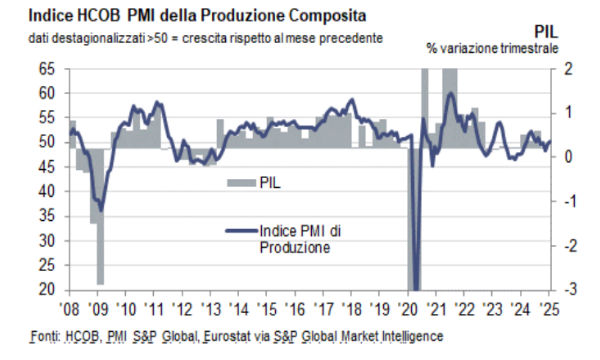 Secondo Cyrus de la Rubia, Chief Economist presso la Hamburg Commercial Bank, "Il lento tasso di crescita del settore terziario, evidente per tutto l'anno scorso, è continuato all'inizio del 2025. Guardandolo con ottimismo, la crescita dello scorso anno delle aziende dei servizi ha giocato un ruolo cruciale nel mantenere in espansione l'economia dell'eurozona. La debole ma lievemente accelerata espansione dei nuovi ordini e degli organici fa sperare in un lieve rinvigorimento del settore in questo primo trimestre dell'anno. I costi operativi di gennaio del settore terziario sono aumentati ad un tasso più rapido, e gli aumenti superiori alla media dei costi salariali dei mesi recenti hanno di sicuro giocato un ruolo chiave in questo.