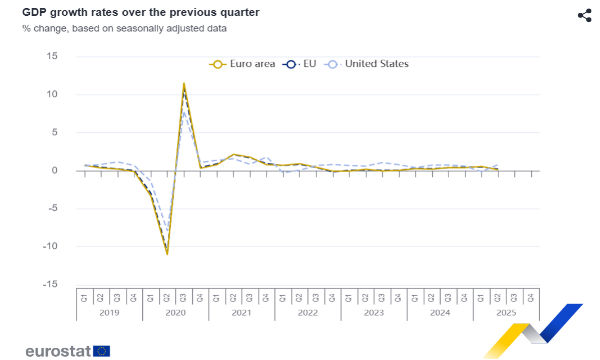 Nel secondo trimestre del 2025, il Prodotto Interno Lordo (PIL) destagionalizzato è aumentato di appena lo 0,1% nell'area dell'euro. Il dato è salito dello 0,2% nell'intera Unione Europea, se confrontato con il trimestre precedente.