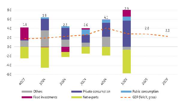 Per quanto riguarda le prospettive, la crescita del PIL dovrebbe mantenersi costante al 2,8% per il 2025. I salari troveranno supporto in un mercato del lavoro ristretto, favorendo i consumi privati.