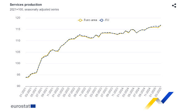 A marzo 2025, raffrontato allo stesso mese dell'anno precedente, la produzione di servizi è cresciuta del 2,9% in entrambe le aree geografiche, Eurozona e UE.