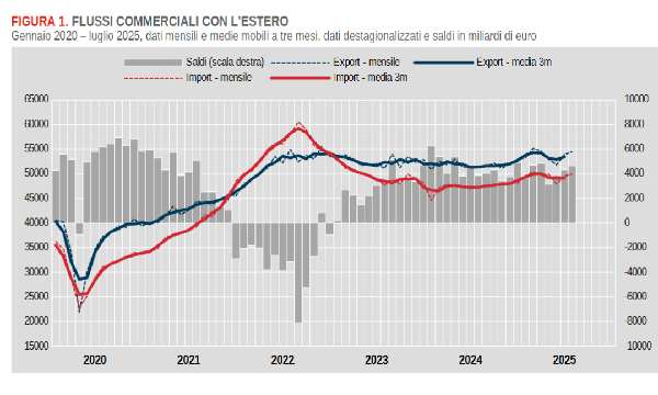 Il balzo mensile dell'export è stato alimentato in gran parte dalle maggiori vendite destinate all'area extra UE, in crescita del 2,4%. Al contrario, l'export verso i paesi dell'UE è rimasto stabile. Analizzando il trimestre maggio-luglio 2025, osserviamo una contrazione dell'export pari all'1,5% e dell'import all'1,8% rispetto al trimestre precedente.