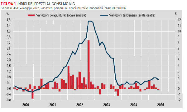 Guardando avanti al resto del 2025, l'inflazione "acquisita", ovvero la crescita media dei prezzi che si avrebbe se l'inflazione rimanesse zero per i restanti mesi dell'anno, si attesta al +1,3% per l'indice generale e al +1,6% per la componente di fondo. Il quadro che emerge è quello di una pressione inflazionistica in progressivo allentamento, guidata principalmente dal comparto energetico e da alcune voci dei servizi, ma con aree di resistenza, come quella degli alimentari lavorati, che mantengono una dinamica di crescita più sostenuta.