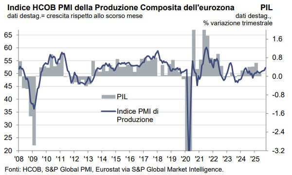 È il decimo mese consecutivo che l'indicatore si mantiene al di sopra della soglia di 50.0, che separa l'espansione dalla contrazione. Questo dato rivela un robusto aumento dell'attività, paragonabile al ritmo più sostenuto degli ultimi due anni e mezzo, già registrato nel maggio 2022. La crescita ha interessato entrambi i settori economici principali, ma è stato il settore terziario a guidare la progressione, con un'espansione dell'attività che non si vedeva dall'agosto 2022. La produzione manifatturiera ha proseguito la sua espansione per l'ottavo mese consecutivo, mostrando un aumento seppur contenuto, lievemente più rapido rispetto a settembre. In questo quadro, la Germania ha evidenziato una crescita della produzione particolarmente vivace, toccando i massimi degli ultimi ventinove mesi. Anche il resto dell'Eurozona, escluse le sue due maggiori economie, la Germania e la Francia, ha registrato un'accelerazione delle attività che non si osservava da due anni e mezzo.