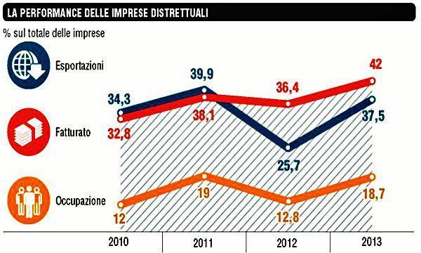 Questa Italia "che va", che guarda al domani con qualche speranza, è l'Italia delle 278mila piccole e medie imprese operanti nei 100 distretti monitorati dall’Osservatorio nazionale, nei quali operano quasi 1,4 milioni di addetti e alle quali si devono circa 75 miliardi di euro di valore aggiunto prodotto. Considerando il complesso delle aree distrettuali, queste imprese concentrano oltre il 50% dell\'occupazione manifatturiera italiana. Un modello - tutto italiano - il cui campione assoluto (in termini di performance economiche nel 2013) è il Metadistretto alimentare Veneto, "tallonato" da due leader toscani: il distretto delle pelli cuoio e calzature di Valdarno Superiore e quello del tessile-abbigliamento di Empoli. Un’Italia che delocalizza meno (e che in qualche caso addirittura dall’estero ritorna "a casa") e che cerca sempre di più la strada della collaborazione con altre imprese (anche all'estero) per essere competitiva.