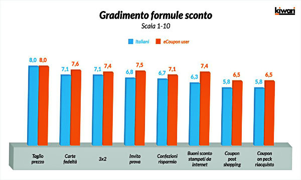 Reperibili presso i portali delle marche o sulle loro pagine Facebook, come pure sulle piattaforme dedicate alla distribuzione dei coupon, questi innovativi strumenti di saving sono molto più apprezzati di altre tipologie di sconto, come i buoni ricevuti dopo aver effettuato il pagamento (e spesso erogati in funzione dell’analisi dello scontrino appena emesso, in combinazione con la carta fedeltà) e quelli on pack, che tipicamente le marche offrono sui prodotti per fidelizzare tramite un riacquisto. Tra gli eCoupon Users, ovvero coloro che utilizzano i buoni sconto stampati da internet, è interessante notare, inoltre, come lo strumento dei buoni sconto sia addirittura preferito alle confezioni risparmio ed equivalente al classico 3 x 2, rivelando come l’essere “costretti” ad un acquisto più consistente si sposi male con l’attuale congiuntura.