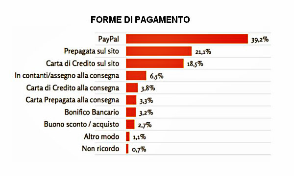 Gli acquisti online sono in gran parte pagati al momento dell’ordine e solo nel 14% dei casi vengono saldati alla consegna o nel momento di utilizzo del servizio (per es., al termine di un soggiorno in Hotel). Il pagamento online contestualmente all’acquisto è cresciuto nell’ultimo anno dall’83% del 2013 all’86% dei primi mesi del 2014.
