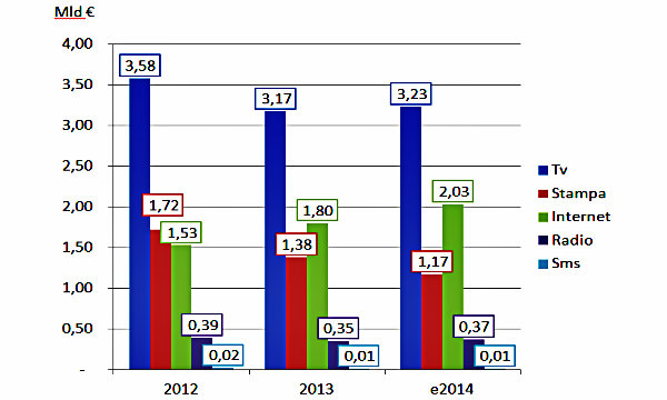 Nel 2013 il fatturato dell’Internet Advertising ha sorpassato quello dell’Advertising a mezzo Stampa: 1,8 contro 1,4 miliardi di euro, pari rispettivamente al 27 e 21 per cento del complessivo mercato pubblicitario italiano. Nel 2012 le quote dei due comparti erano ben diverse, con l’Advertising sulla Stampa che si attestava al 24% e l’Internet Advertising che aveva raggiunto il 21% del totale investimenti pubblicitari.