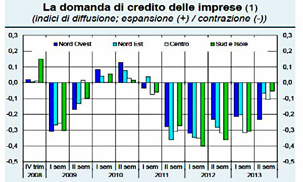 Nella seconda parte del 2013 la debolezza della domanda di finanziamenti proveniente dalle imprese, generalizzata a tutte le aree del Paese, e' stata più intensa nel Nord Ovest