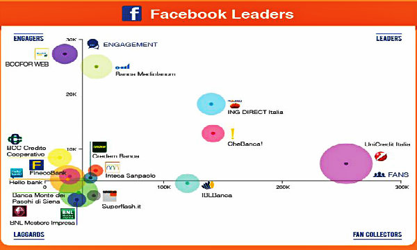 Su Facebook Unicredit è la pagina che ha accumulato più likers, ma quelle che riescono a coinvolgere maggiormente i propri sostenitori sono BCCforWeb e Mediolanum, soprattutto con post “leggeri”, che esulano dal tema finanziario. UniCredit Italia è invece la pagina più seguita per numero di fan ed è tra quelle che pubblicano più contenuti. Tra questi risultano di grande impatto la ricerca di neolaureati per stage in UniCredit e le fotografie vincitrici del concorso PinTower. Per quello che riguarda gli utenti, più di due terzi degli autori che hanno interagito con le pagine Facebook del settore sono uomini: la banca con cui interagiscono di più in assoluto è Fineco, soprattutto con post riguardanti il trading e domande tecniche. Le donne invece interagiscono maggiormente con le pagine che pubblicano contenuti più leggeri o votati all’intrattenimento e concorsi, come per esempio IBL Banca.