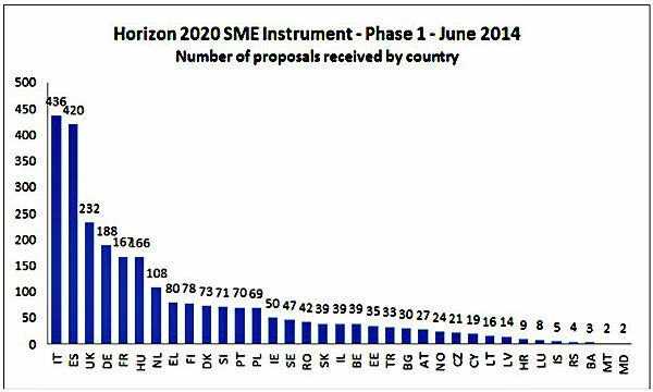 Questo, in termini percentuali, si traduce in un “success rate” pari al 6,79%, contro il 10% auspicato dalla Commissione in fase di progettazione dello strumento. Un altro dato significativo riguarda la ripartizione geografica dei fondi: i progetti presentati provenivano da PMI di 35 Paesi tra membri Ue e associati, mentre quelli finanziati saranno a beneficio solo di 21. Il dato riguardante la partecipazione italiana è ancora una volta dicotomico. Il nostro Paese guida la graduatoria per Paese in termini di proposte presentate (436), ma scende al terzo posto come numero di proposte finanziate (20).