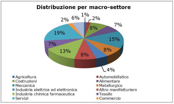 I macro settori più rappresentati sono quello dei servizi (con 1.541 imprese selezionate), e in particolare il comparto degli studi professionali/di consulenza (con 550 imprese) e quello dell'attività di trasporto e magazzinaggio (384 imprese), unitamente alla meccanica (con 1.215 imprese) e all'industria chimica farmaceutica (con 1.004 imprese). Seguono i settori costruzioni (659), gli altri settori del manifatturiero (619) e quello metallurgico (601).