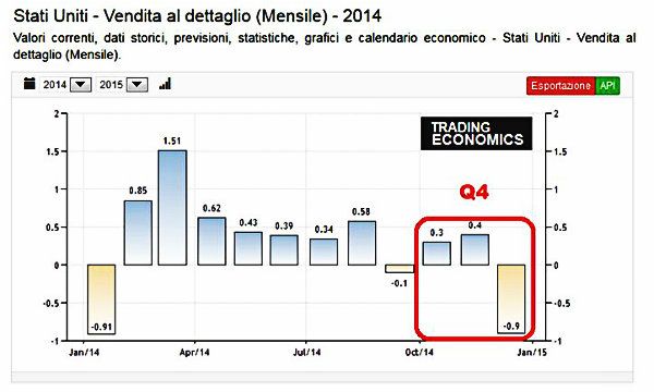 Come è possibile una simile performance se a dicembre, un mese celebrato come spettacolare nelle aspettative, le vendite al dettaglio sono scese del 0,9% rispetto a novembre e i dati di novembre e ottobre rivisti rispettivamente al ribasso dal +0,7% allo 0,3% e dallo 0,5% allo 0,3%?