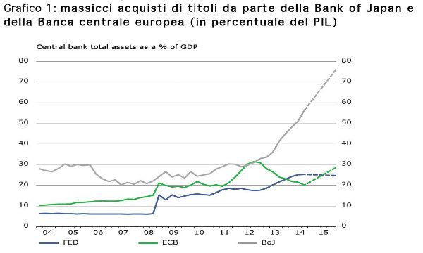 1. È un'ulteriore conferma della divergenza delle politiche monetarie a livello mondiale. La Fed, da un lato, dovrebbe cominciare ad alzare i suoi tassi di interesse quest'anno. La BCE e la Bank of Japan, dall'altro, stanno combattendo attivamente i rischi di deflazione attraverso una rapida espansione dei loro bilanci (vedi grafico 1).