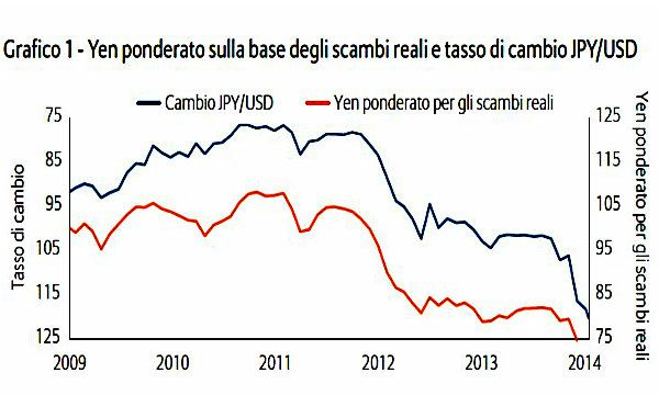L'impatto principale dell'Abenomics ha riguardato lo yen che, come evidenziato nel grafico, si è svalutato molto rispetto al dollaro negli ultimi tre anni e continua la tendenza al ribasso. La portata dell'impatto (positivo) sull'economia reale è dubbia, dato che buona parte della capacità produttiva dell'industria giapponese è stata trasferita all'estero.