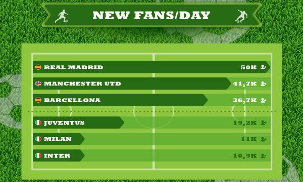 Peraltro la distanza tra l'Italia e l'estero nella capacità di consolidare la propria community su Facebook aumenta giorno dopo giorno, con il Real Madrid che guadagna 50 mila fan al giorno nel periodo analizzato contro i 19 mila della Juventus, gli 11 mila del Milan ed i 10,9 mila dell'Inter. Ancora più indietro Roma e Napoli.