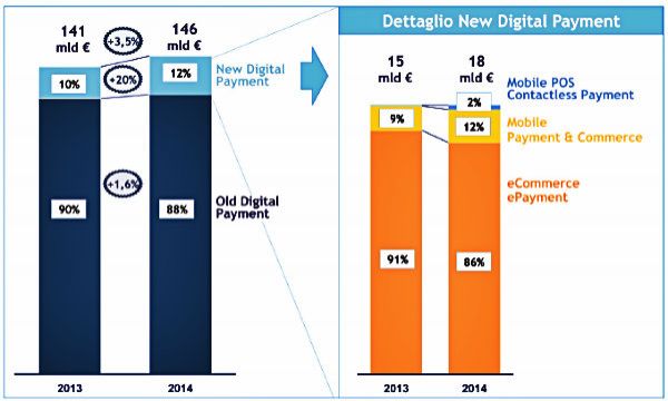 "Gli italiani non hanno ancora rinunciato al contante, ma i pagamenti digitali innovativi (New Digital Payment) li stanno progressivamente abituando a utilizzare la carta di credito con maggiore frequenza e per beni di piccolo importo, soprattutto tramite acquisti e pagamenti via cellulare", ha affermato Alessandro Perego, Responsabile Scientifico dell'Osservatorio Mobile Payment & Commerce. Infatti, mentre i pagamenti elettronici con carta di credito crescono nel 2014 solo dell'1,6% passando da 126 a 128 miliardi di , i New Digital Payment ottengono un incremento del 20%: passano da 15 a 18 miliardi di euro e conquistano il 12% dell'intero mercato dei pagamenti digitali, che può così registrare un incremento complessivo del 3,6% e arrivare a quota 146 miliardi di euro. "Tuttavia è possibile fare qualcosa in più e ci attendiamo una crescita media, tra il 2015 e il 2017, pari al 7% annuo, che porterà questo mercato a raggiungerei 176 miliardi di euro. Per agevolare questa crescita occorrono sia un intervento normativo che proponga incentivi e diffonda conoscenza, sia l'impegno, da parte del mondo dell'offerta, a puntare sui New Digital Payment", ha aggiunto Perego.