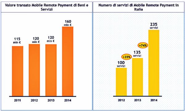 Il Mobile Remote Payment di beni e servizi, ovvero il pagamento dei biglietti di trasporto pubblico locale, parcheggi, ricariche telefoniche e bollettini, cresce e raggiunge i 160 milioni di euro. Le ricariche telefoniche continuano a rappresentare il 70% del mercato (+22% rispetto al 2013). Crescono anche i pagamenti di bollette e bollettini (+37% rispetto al 2013).